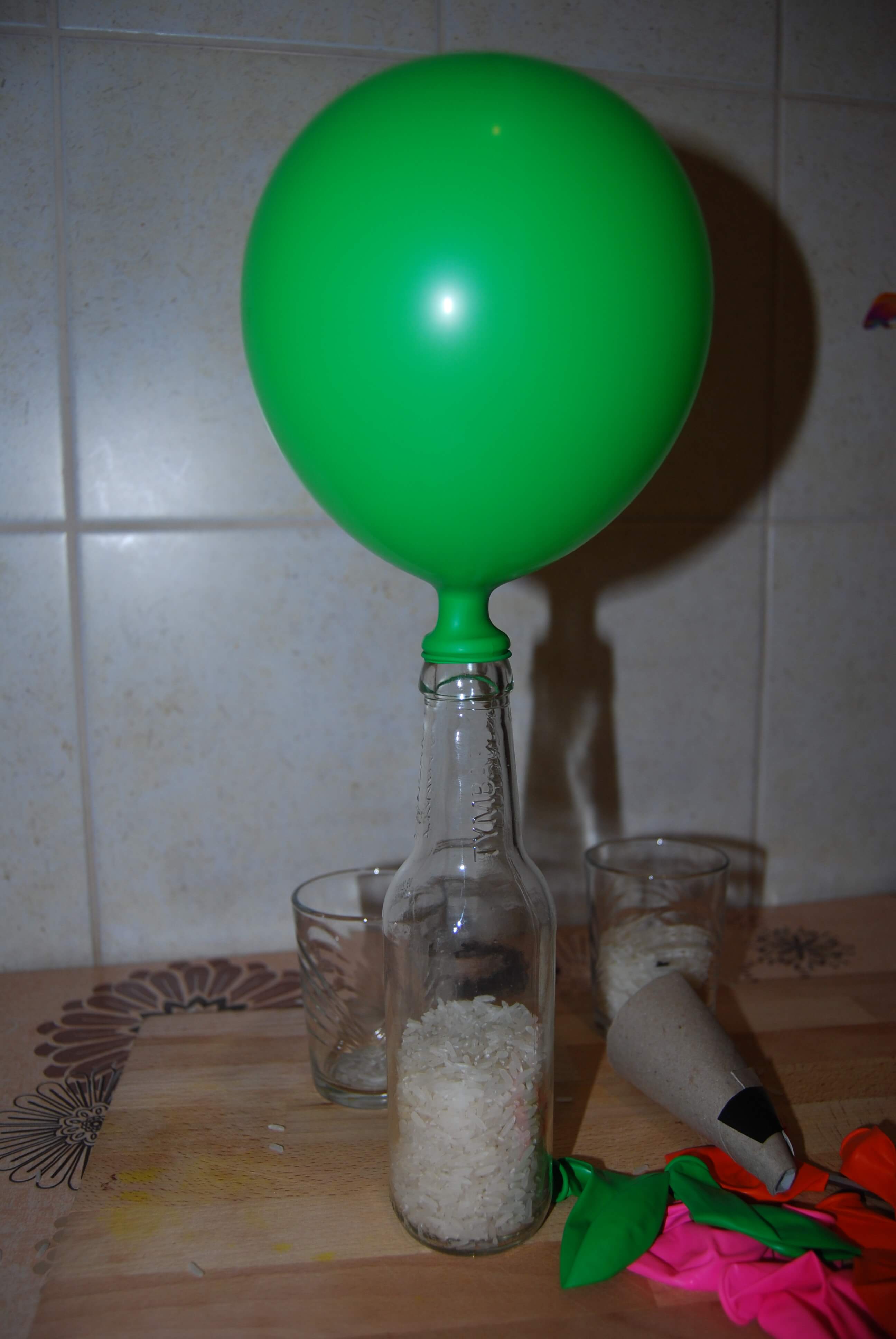 This part may be a little tricky. Take one balloon and blow it until it is full of air, then without letting air from inside to flow out, gently but quickly attach the balloon using its opening on the bottle. The tricky part comes here so pay attention. Stick the balloon over the bottle top and flip it upside down to let the rice fall into the balloon. This may require a couple of tries for people starting out but with a little practice, you will get it. As you fill in the balloon, gently twist in a pulling motion the balloon to help the filling to flow until the balloon is completely full. Then gently remove the balloon neck from the bottle.